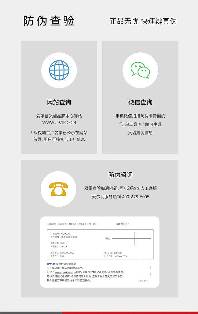 为保障您的合法权益,避免给您带来法律风险及诉累,请客户在采购爱尔创产品时,务必通过我司官方渠道或授权经销商进行采购,并索要合法票据和采购凭证。广大消费者可通过以下方式验证爱尔创全瓷牙真伪: